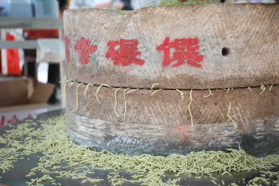一个厚重久远的历史文化,一段悠长难忘的思乡情结,一种清香爽口的时令美味,一粒粒的青麦仁温润如粒粒青色玉石,新炒的麦籽飘散出阵阵芳香,随着转动的石磨,一根根绿色自然的碾馔垂落下来,新鲜无比。