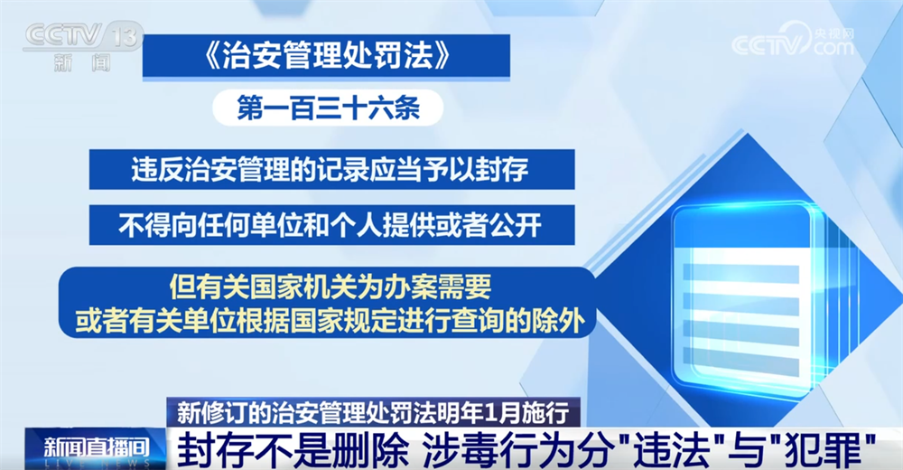 央视网消息:将于明年1月1日起实施的新修订《中华人民共和国治安管理处罚法》中第一百三十六条确立的“治安违法记录封存制度”近日引发关注,其中,因吸毒有治安处罚记录也在被封存的范围内引发热议。一边是每年超800万曾受治安处罚群体对“摆脱终身标签”的期待,一边是公众对“记录封存是否等同于纵容违法”“是否为特定人群开绿灯”的担忧,围绕这些热点问题,我们来看一看专家怎么说。